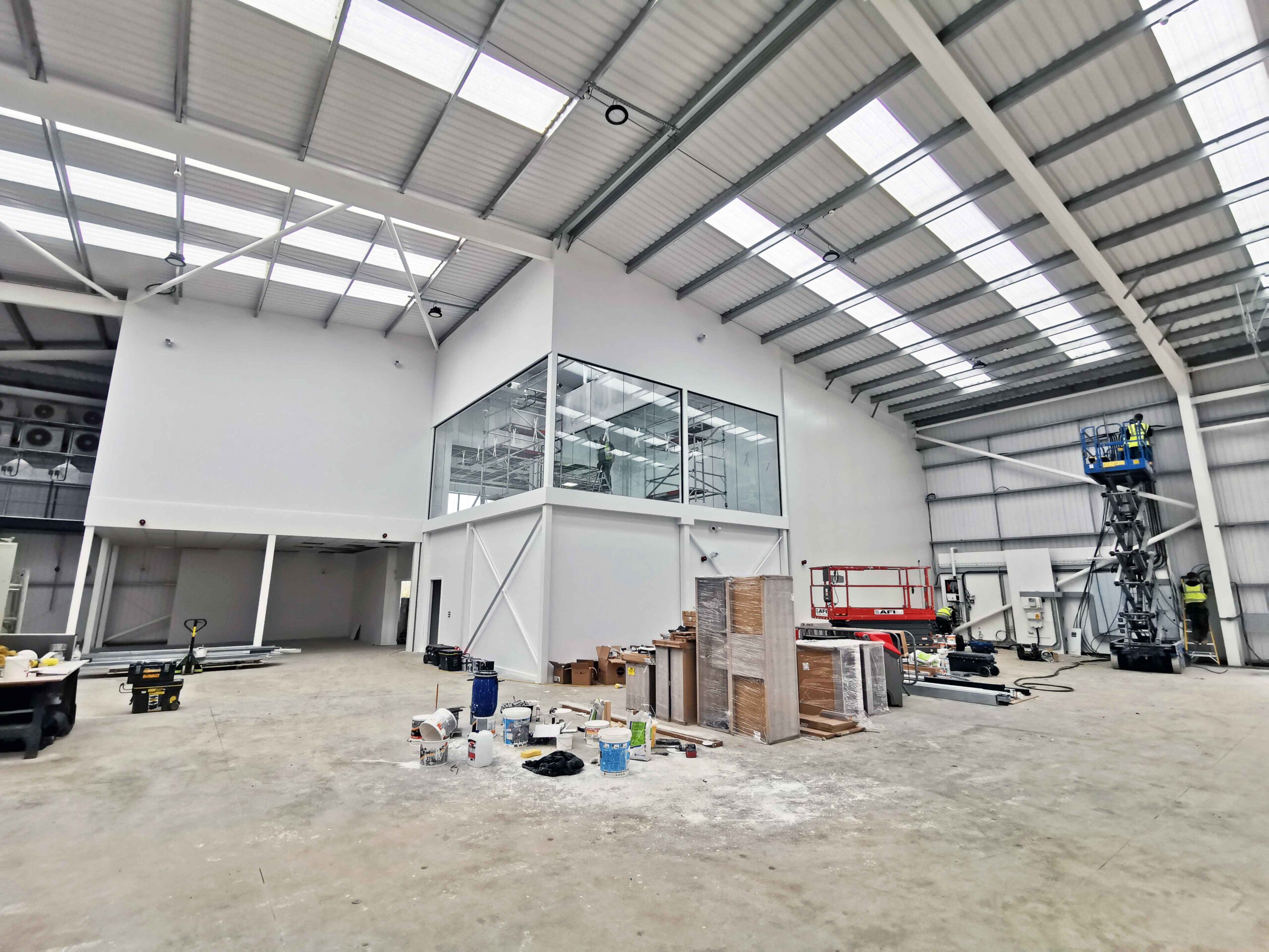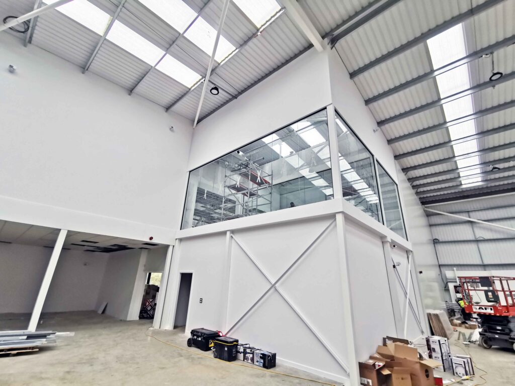 With both mezzanine floors installed including all necessary fire rated elements, the team have done a great job getting the shell of the office pods completed. With the perimeter glazing now installed the focus now shifts to all of the interiors elements of the project, Our mechanical & electrical engineers have been busy installing the infrastructure for all the major services including lighting, power, data, fire alarms, air-conditioning and heat recovery vent.